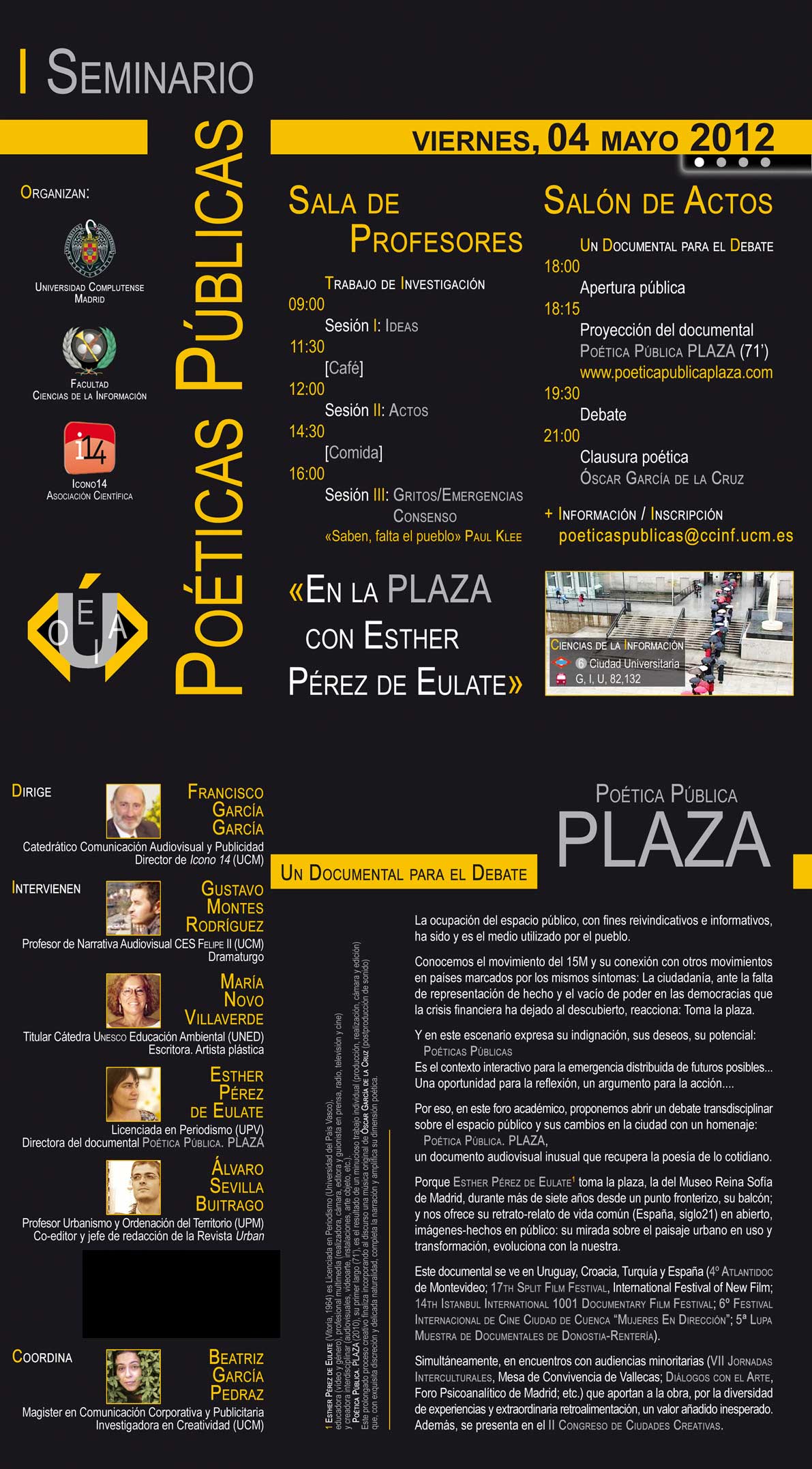 Parece que hay algún cambio en el programa del acto de este viernes en torno al documental de Esther Pérez de Eulate; ahí va el nuevo cartel. La sesión de debate se emitirá en directo (19:30h.) a través del canal de la Complutense.