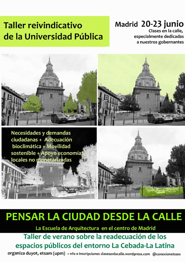 Durante la próxima semana se desarrollará un taller de verano sobre la adecuación del espacio público del entorno de la Plaza de la Cebada en el madrileño barrio de la Latina. Se trata de una propuesta muy especial. El taller se desarrollará in situ y está organizado por un grupo de profesores de la Escuela de Arquitectura de Madrid con el objetivo de visibilizar la labor docente y el aprendizaje de los estudiantes universitarios, en protesta por los recientes recortes en la enseñanza pública y el creciente descrédito que algunas instituciones pretenden sembrar en nuestra sociedad.