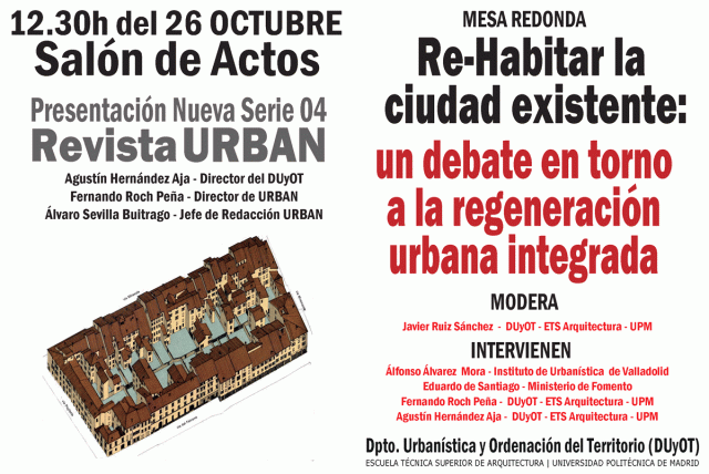 El próximo viernes día 26 de octubre, a las 12:30, se realizará en la Escuela de Arquitectura de Madrid la presentación del nuevo número de la revista Urban. Seguirá a la presentación una mesa redonda sobre regeneración urbana integrada, al hilo de la sección Debate incluida en este número, en la que participaron Luis Moya, Ainhoa Díez, Alfonso Álvarez Mora y Agustín Hernández Aja, bajo la coordinación de Javier Ruiz.