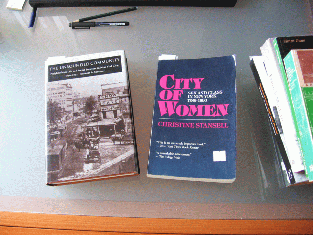 Terminando estos días la lectura de materiales para los próximos artículos en los que estoy trabajando; más madera sobre NYC para ir, como en la canción, ‘right through the very heart of it’. Los últimos libros en llegar son The Unbounded Community: Neighborhood Life and Social Structure in New York City, 1830–1875, de Kenneth A. Scherzer (Duke University Press, 1992) y el excepcional City of Women: Sex and Class in New York, 1789-1860, de Christine Stansell (University of Illinois Press, 1987).