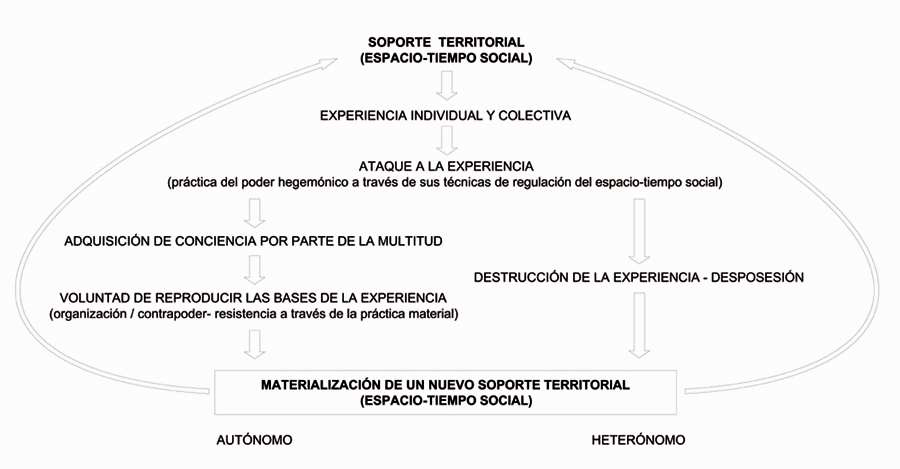 La idea, expresada en aquel artículo de forma un tanto cruda, era que el empobrecimiento o eclipse de la experiencia que diversos autores —por citar algunos, Richard Sennett, Marshall Berman o, sobre todo, Giorgio Agamben— han identificado en la ciudad contemporánea no era casual, sino el fruto premeditado de una larga historia de desposesión espacial de toda una serie de capitales sociales subalternos, formas de organización socioespacial que habían permitido a los grupos más vulnerables apropiarse de áreas de la ciudad y conquistar ciertas parcelas de autonomía cotidiana. La supresión de estas destrezas colectivas había permitido a una serie de élites históricas imponer su propio esquema de orden social, pero había convertido también la vida urbana en una cadena de fenómenos anodinos. Esa historia —que es la de la planificación urbana capitalista— debía ser rastreada en este sentido crítico como paso previo a una transformación de las técnicas urbanísticas que nos permitiera imaginar futuros urbanos alternativos donde el nexo de espacio y vida cotidiana se abriera a formas políticas emancipatorias en un horizonte de autogestión y autonomía crecientes. Incluso utilizaba un esquema para ilustrar la dialéctica de territorializaciones autónomas/heterónomas, una de las pocas veces que he recurrido a este tipo de canales de comunicación, de los que dudo mucho, a pesar de que en general es lo que más llamó la atención de aquel trabajo.
