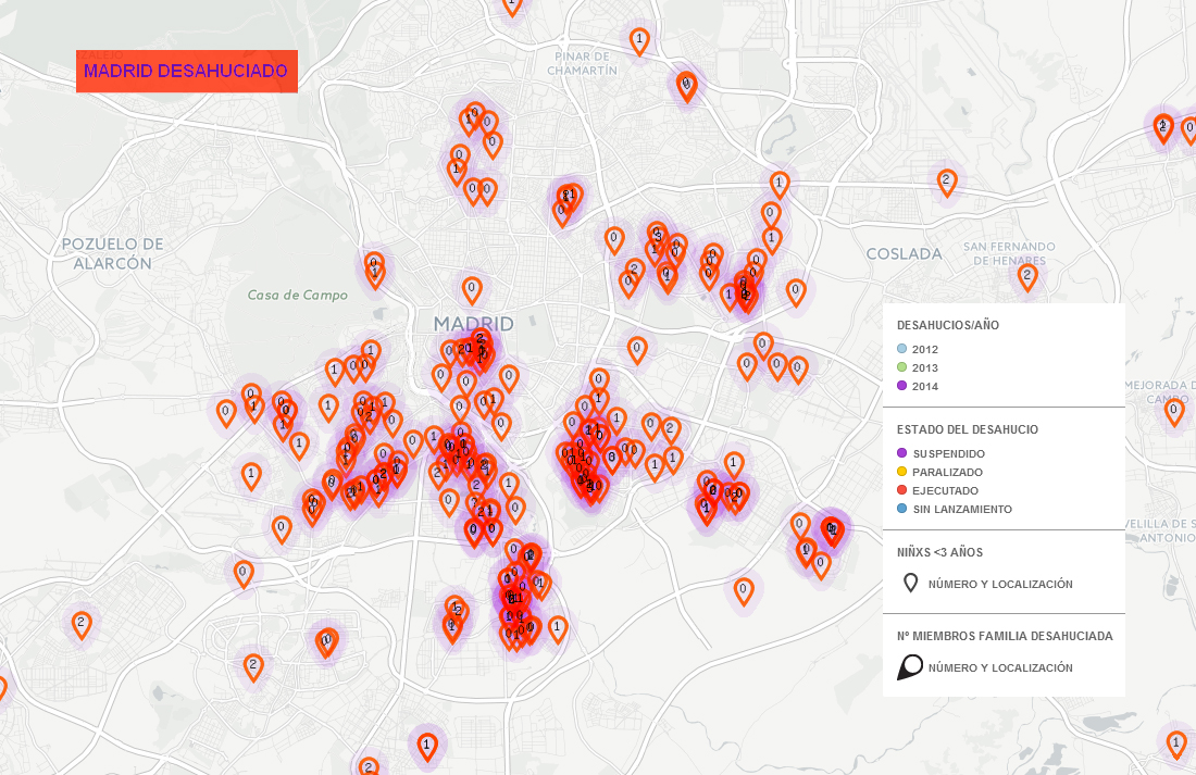 El Vivero de Iniciativas Ciudadanas ha elaborado un interesantísimo mapa de las acciones de Stop Desahucios y la Plataforma de Afectados por la Hipoteca entre 2012 y 2014, una herramienta que permite cartografíar el paisaje de la desposesión residencial en Madrid y su área metropolitana. Se trata de un mapa interactivo con geolocalización de casi 800 acciones de resistencia contra desahucios organizadas por estas plataformas en dos años — una acción cada 1,5 días, lo que da una idea no sólo de la intensidad en la movilización de los movimientos en estos años, sino también de la triste experiencia cotidiana del desalojo y el despojo de centenares de familias.