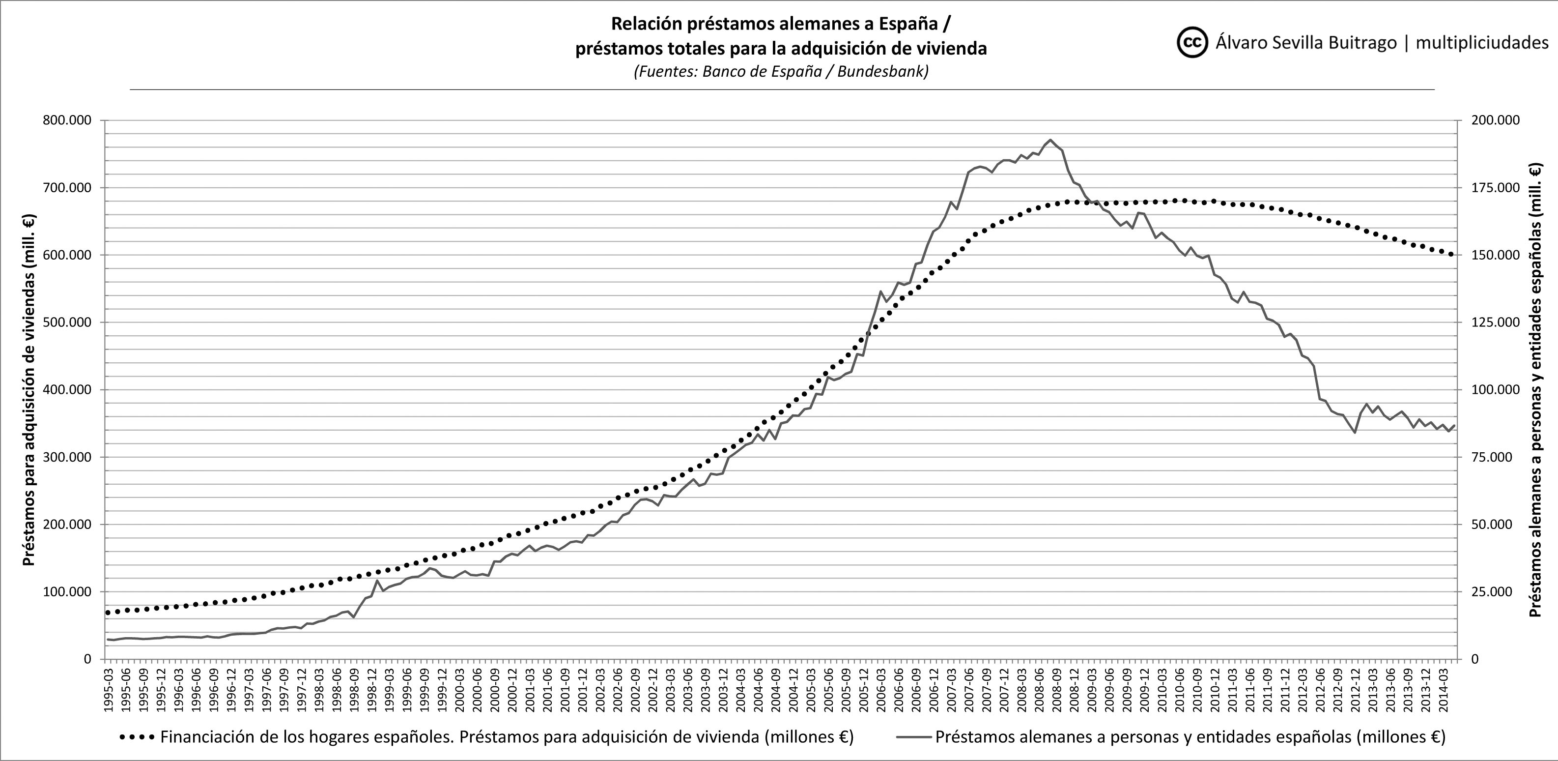 Yo mismo, de forma intuitiva, había empleado este argumento a menudo, de modo que tomé el artículo de Ciudades como oportunidad para profundizar algo más en el asunto. En todo esto seguía las indicaciones del maestro Vicenç Navarro, que había sostenido esta idea en varias entradas de su blog, especialmente aquí. En particular, me interesaba comprender la evolución paralela del flujo de crédito de Alemania a España —fundamentalmente interbancarios, aunque no sólo— y de las hipotecas en nuestro país, su orden de magnitud, así como su relación particular con ciertos hitos del urbanismo y la crisis recientes.
