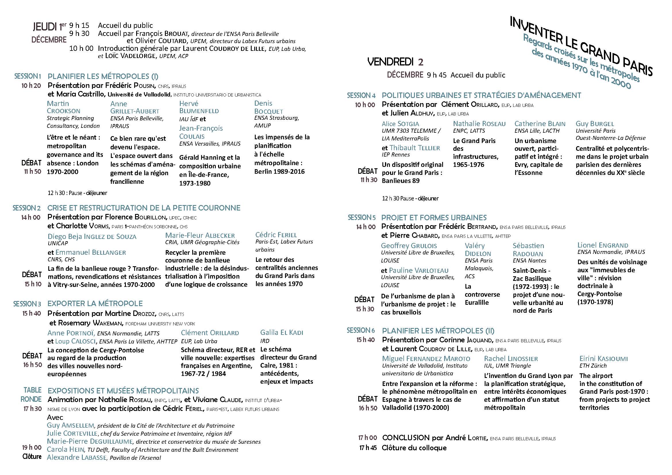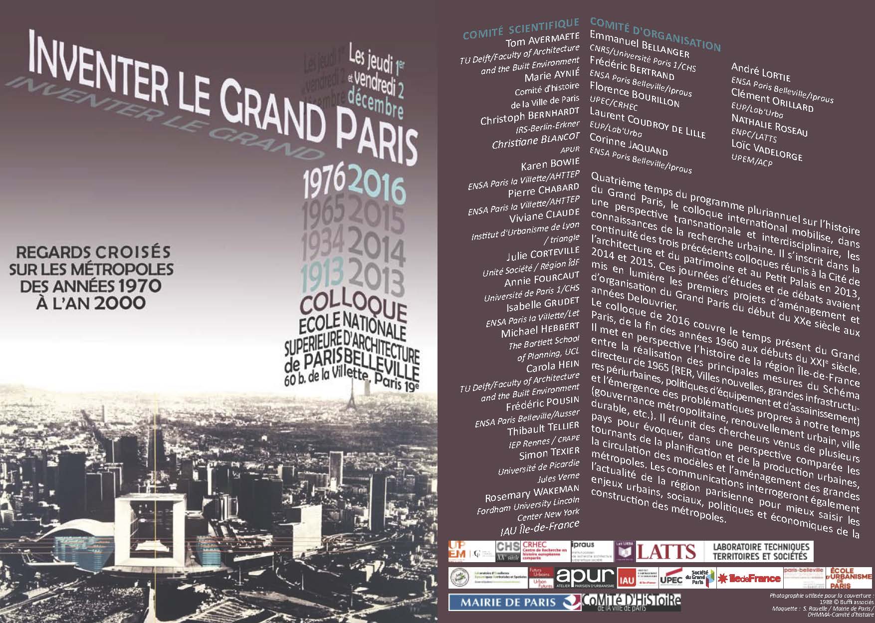 Le colloque de 2016 couvre le temps présent du Grand Paris, de la fin des années 1960 aux débuts du XXIe siècle. Il met en perspective l’histoire de la région Île-de-France entre la réalisation des principales mesures du Schéma directeur de 1965 (RER, Villes nouvelles, grandes infrastructures périurbaines, politiques d’équipement et d’assainissement) et l’émergence des problématiques propres à notre temps (gouvernance métropolitaine, renouvellement urbain, ville durable, etc.). Il réunit des chercheurs venus de plusieurs pays pour évoquer, dans une perspective comparée les tournants de la planification et de la production urbaines, la circulation des modèles et l’aménagement des grandes métropoles. Les communications interrogeront également l’actualité de la région parisienne pour mieux saisir les enjeux urbains, sociaux, politiques et économiques de la construction des métropoles.